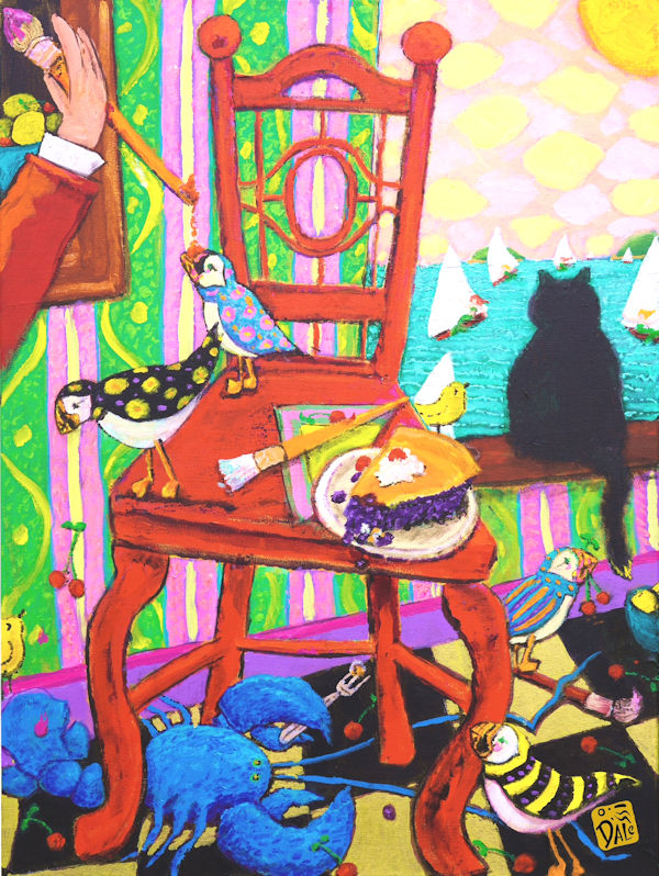 "On vacation in Maine we fell in love with the painting "Fat Cat!"  Returning home I contacted Linda and she recommended a full size reproduction.  My goodness, when it arrive we were more than thrilled!  We love Russ's work.  We now stop on our annual Bar Harbor trip to marvel at all his work  We can't wait until we are able to have "Fat Cat" joined by another of Russ's creations... Sherry & Janice